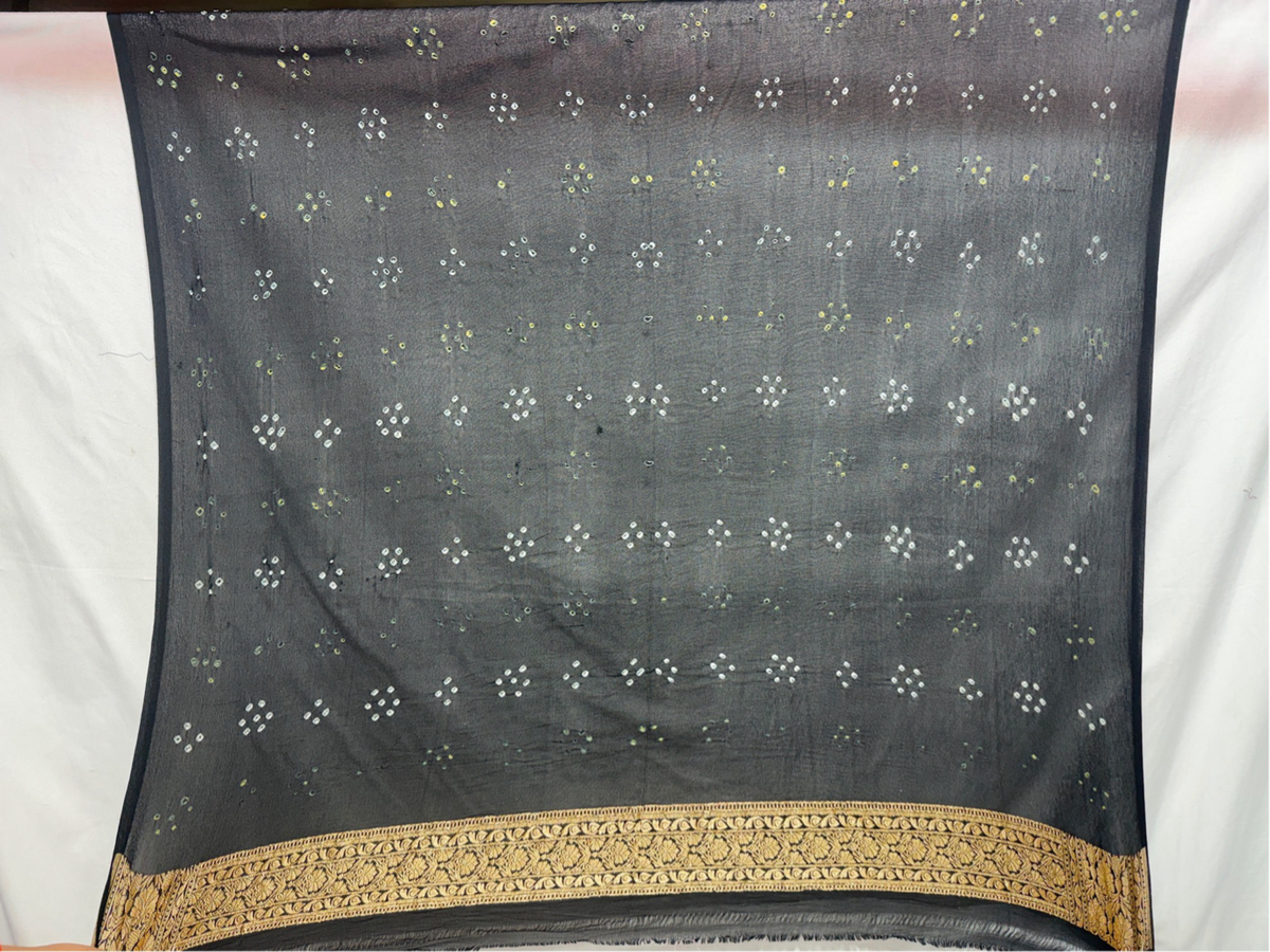 - Color & Work: A graceful All Over Black saree with delicate Bandhani patterns, reflecting timeless artistry and vibrant charm.
