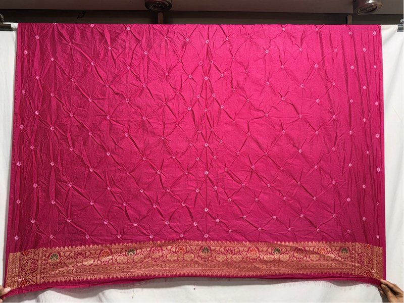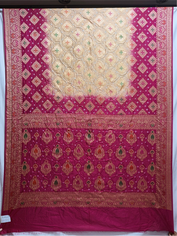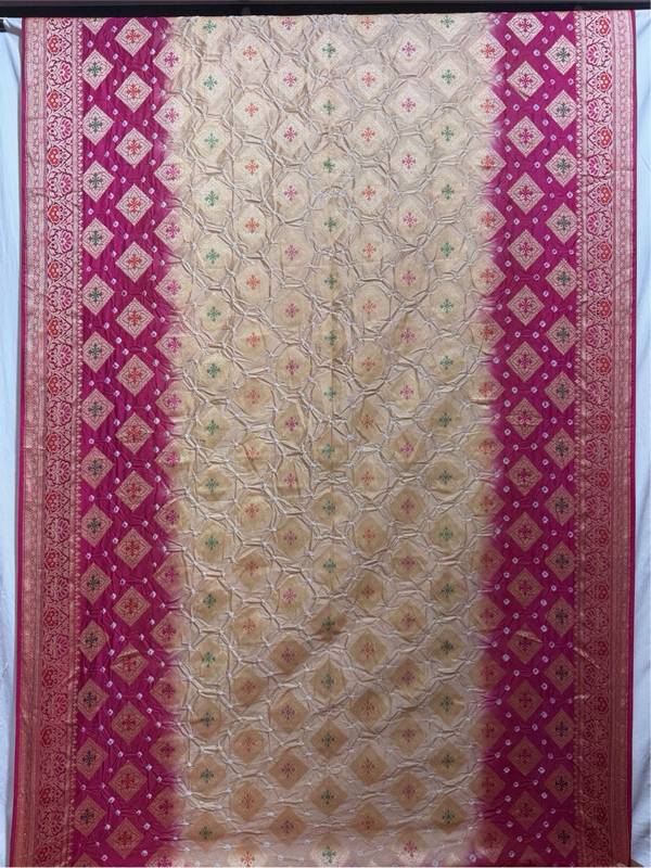 Kala Sanskruti Cream & Rani Pink Color Dupion Silk Bandhani Saree 6.5M with Blouse Piece Elegant Traditional Wear Bridal Saree for Women