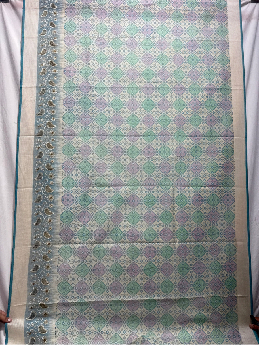 - Color & Work: Cream & Sky Blue design embellished with Hand Made Bandhani, highlighting artisanal craftsmanship.