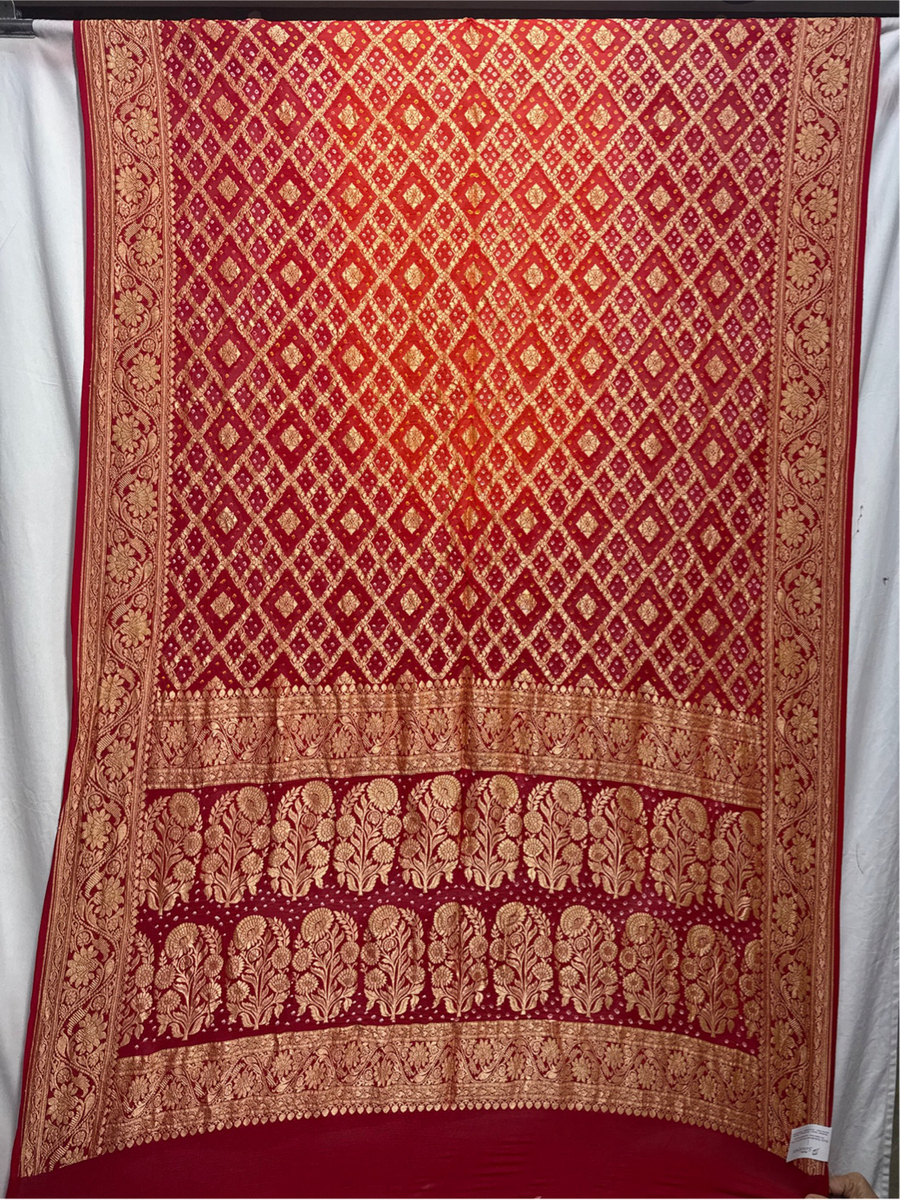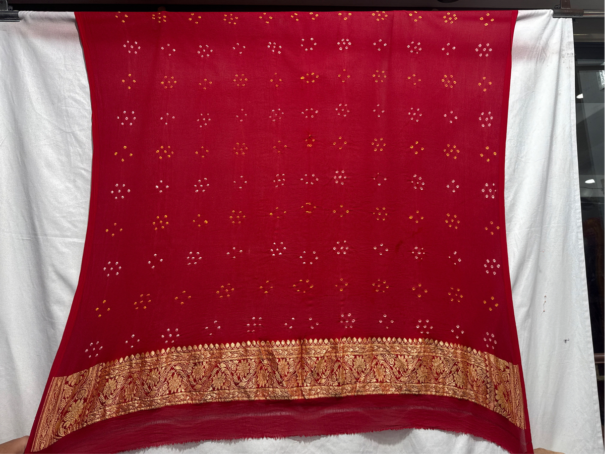 - Material: Made from premium Banarasi Georgette fabric with traditional Bandhani work, offering elegance, comfort, and durability.