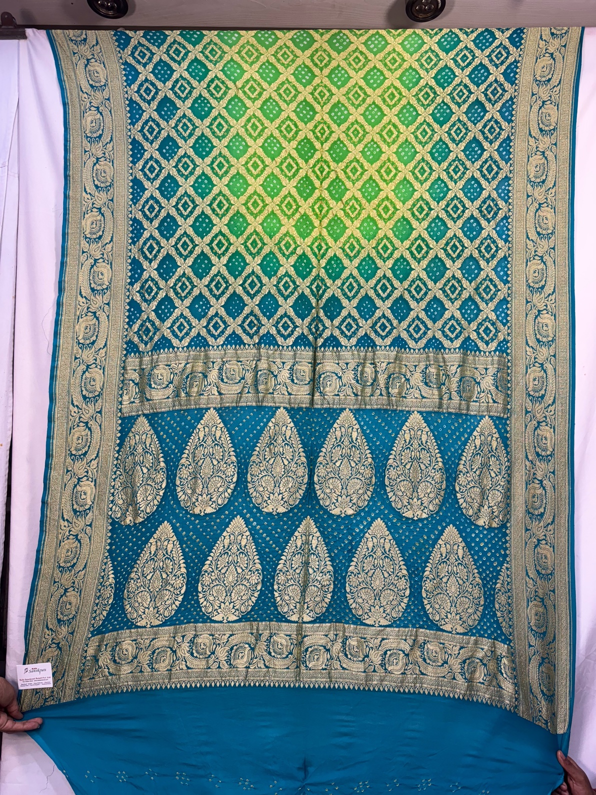 Kala Sanskruti Parrot Green & Sky Blue Banarasi Georgette Bandhani Saree – Saree with Blouse – 6.5M – Wedding, Festive & Party Wear Saree