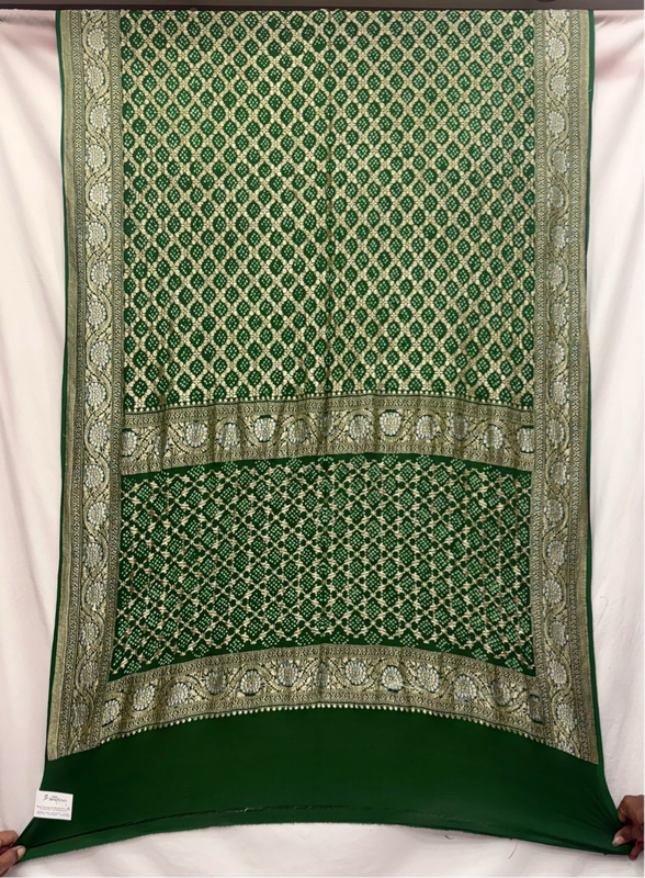- Color & Design: All Over Green Hand Made Bandhani motifs across the body, classic Banarasi motifs and weaving.