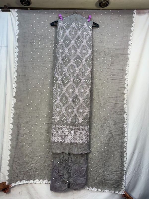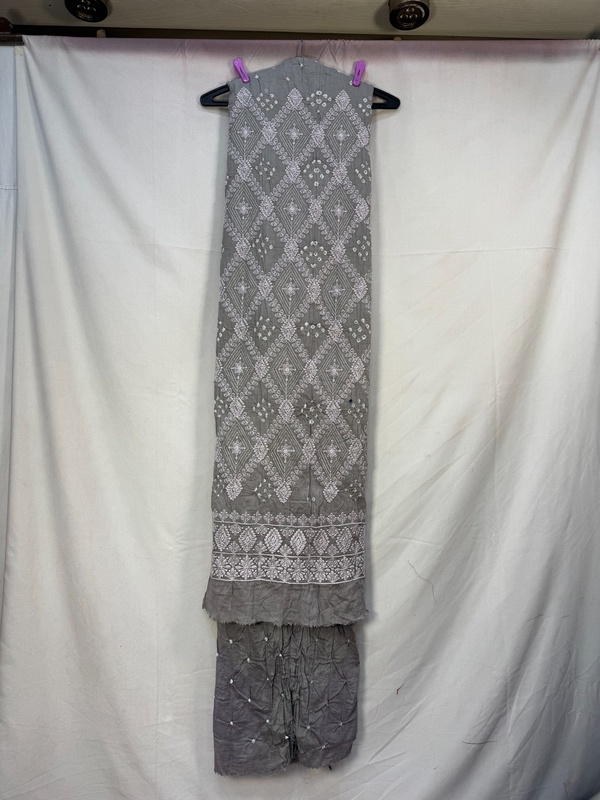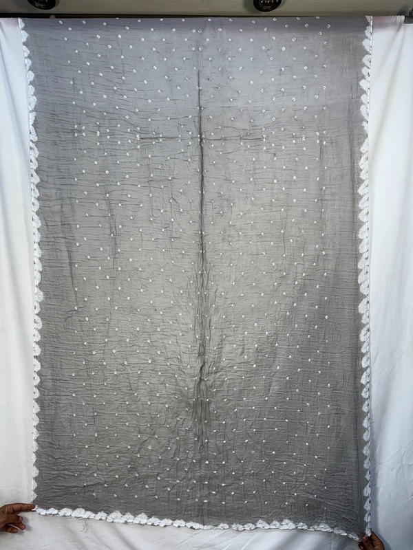- Color & Work: All Over Gray design embellished with Hand Made Bandhani, highlighting artisanal craftsmanship.