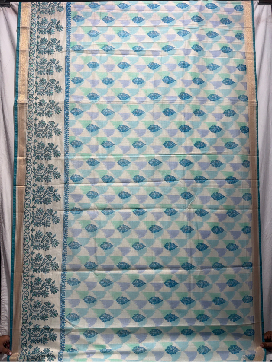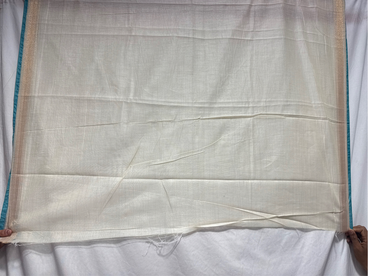 • Color & Work: Cream & Sky Blue design embellished with Hand Made Bandhani, highlighting artisanal craftsmanship.