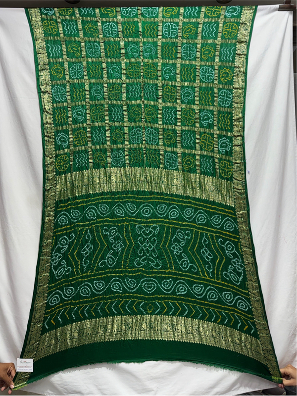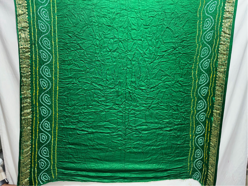 - Color Story: Striking All Over Green complemented with Hand Made Bandhani Gharchola.