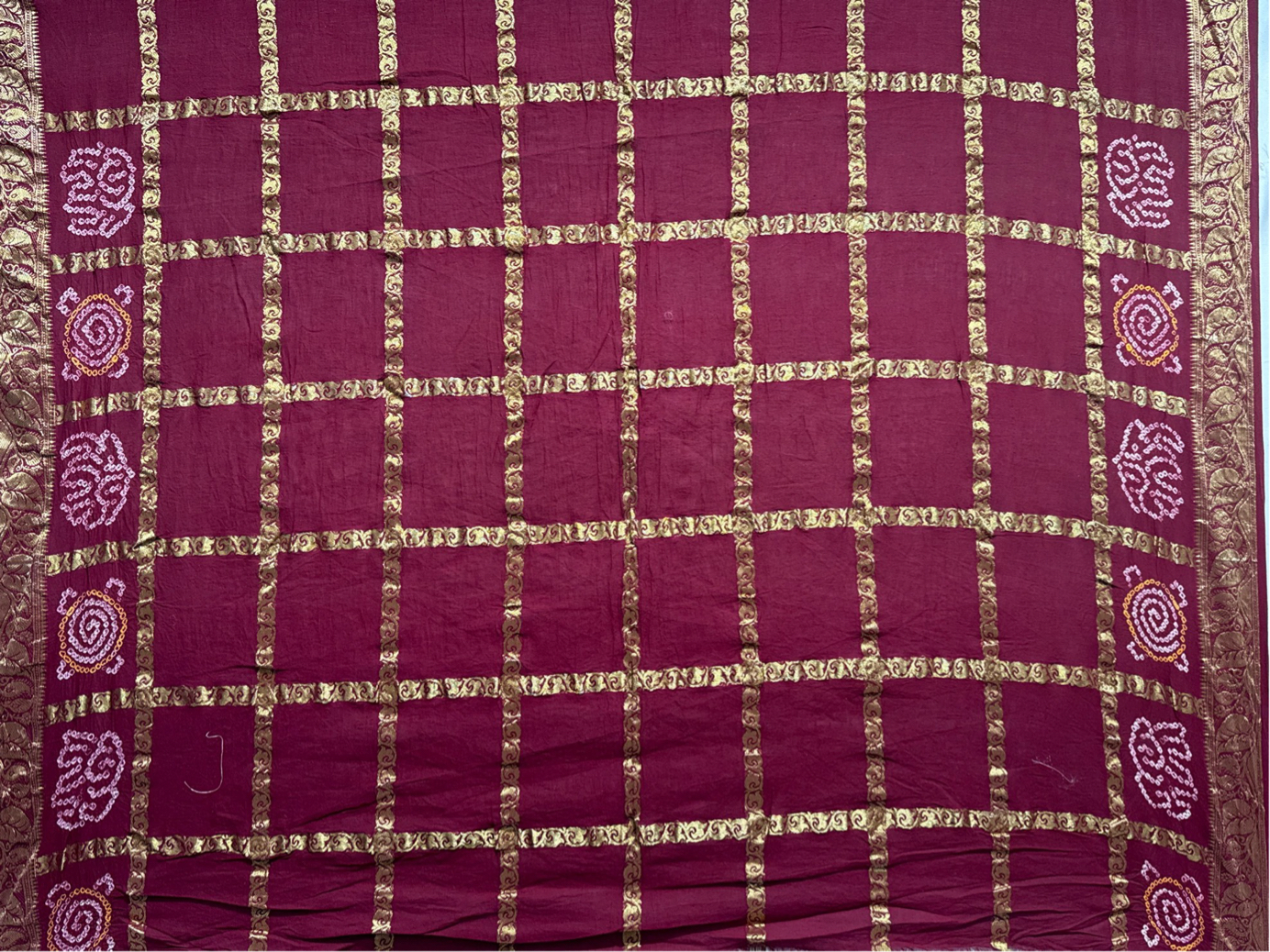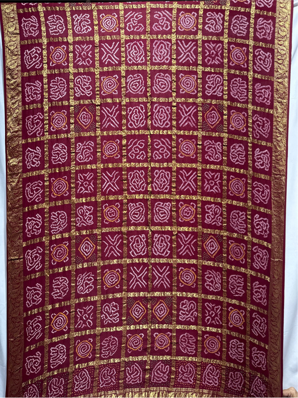 - Color & Work: All Over Maroon design embellished with Hand Made Bandhani, highlighting artisanal craftsmanship.