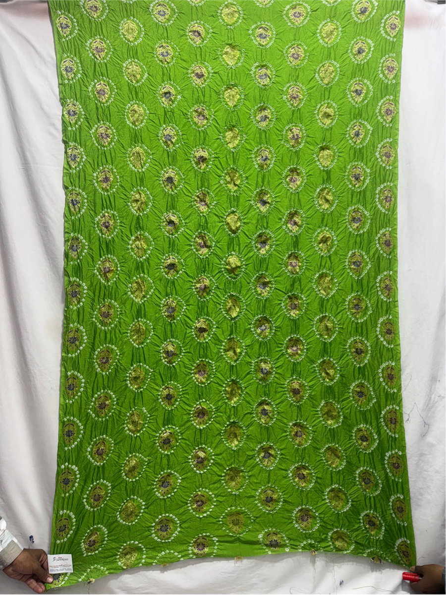 Color & Work: All Over Parrot Green Kurti material featuring handcrafted Bandhani patterns, giving a rich ethnic appeal.