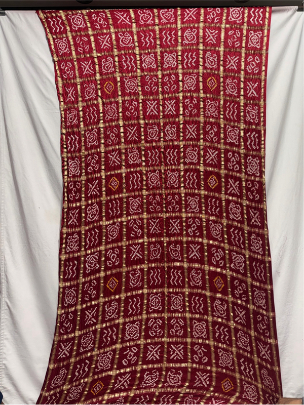 • Color Story: Striking All Over Maroon complemented with Hand Made Bandhani Gharchola.