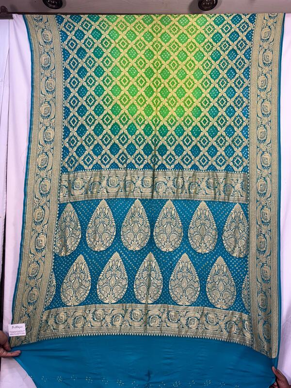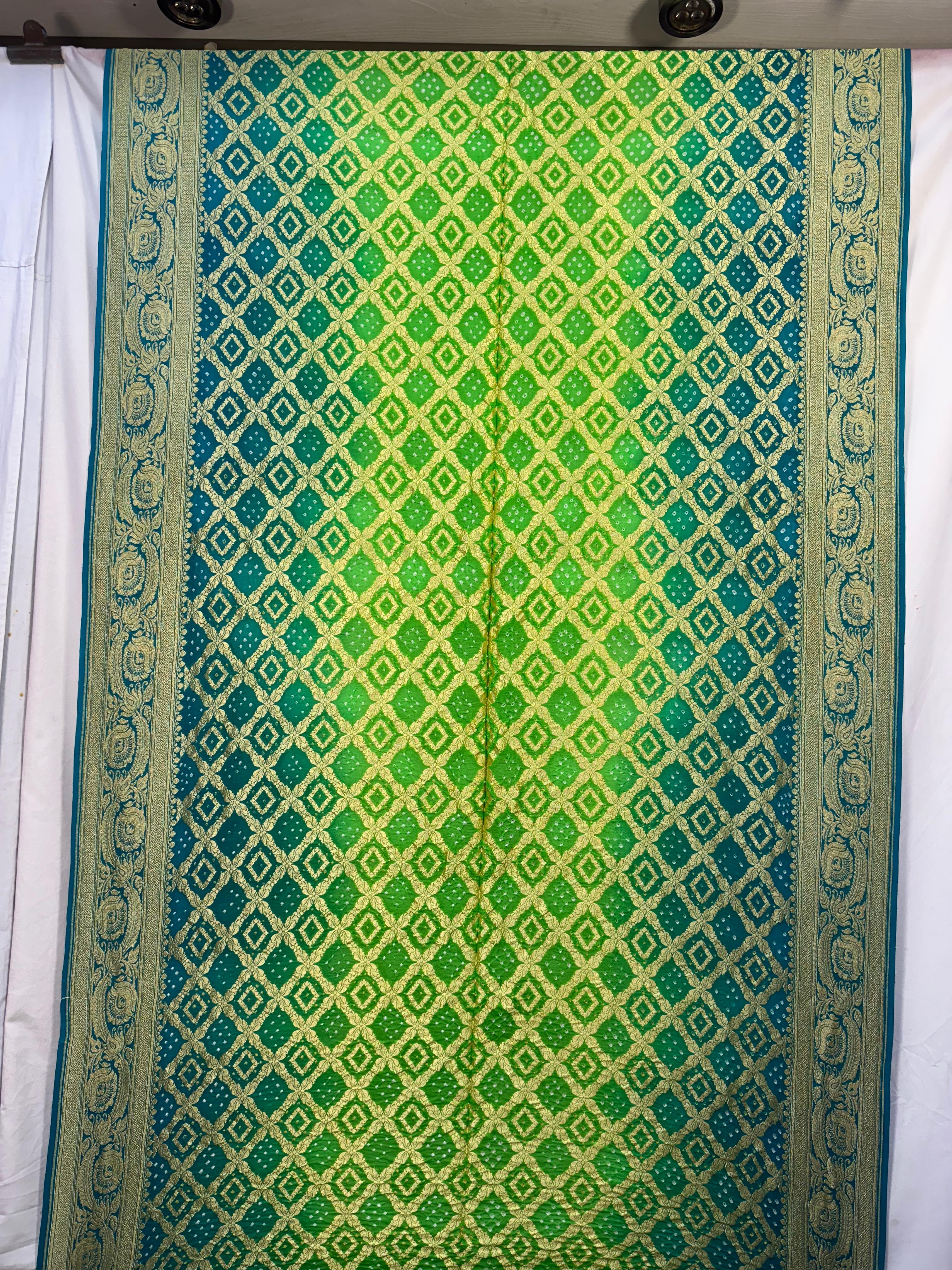 Color & Work: A refreshing dual-tone Light Blue & Parrot Green saree, beautifully enhanced with all-over Bandhani motifs for a vibrant and ethnic appeal.