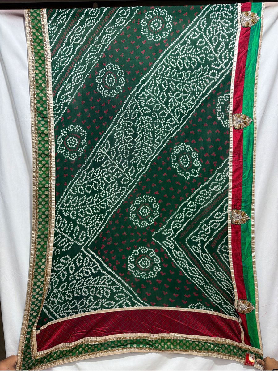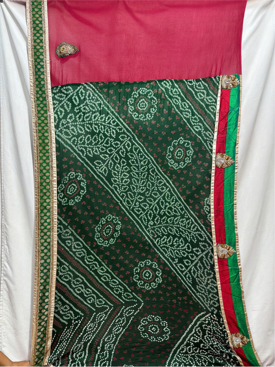 - Color & Work: A striking dual-tone Green & Red combination, beautifully adorned with handworked Bandhani motifs, giving the saree a vibrant and regal ethnic appeal.