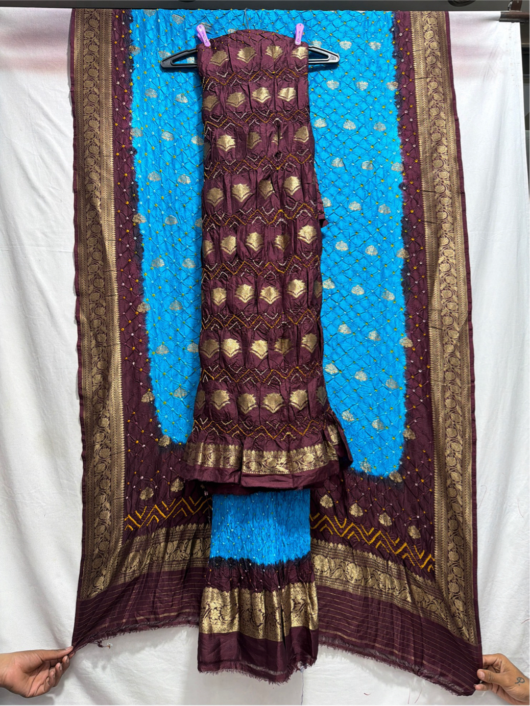 Kala Sanskruti Chocolate Sky Blue Color Pure Silk Bandhani Dress 2.5 M Each Piece Elegant Traditional Wear Pure Silk Dress for Women