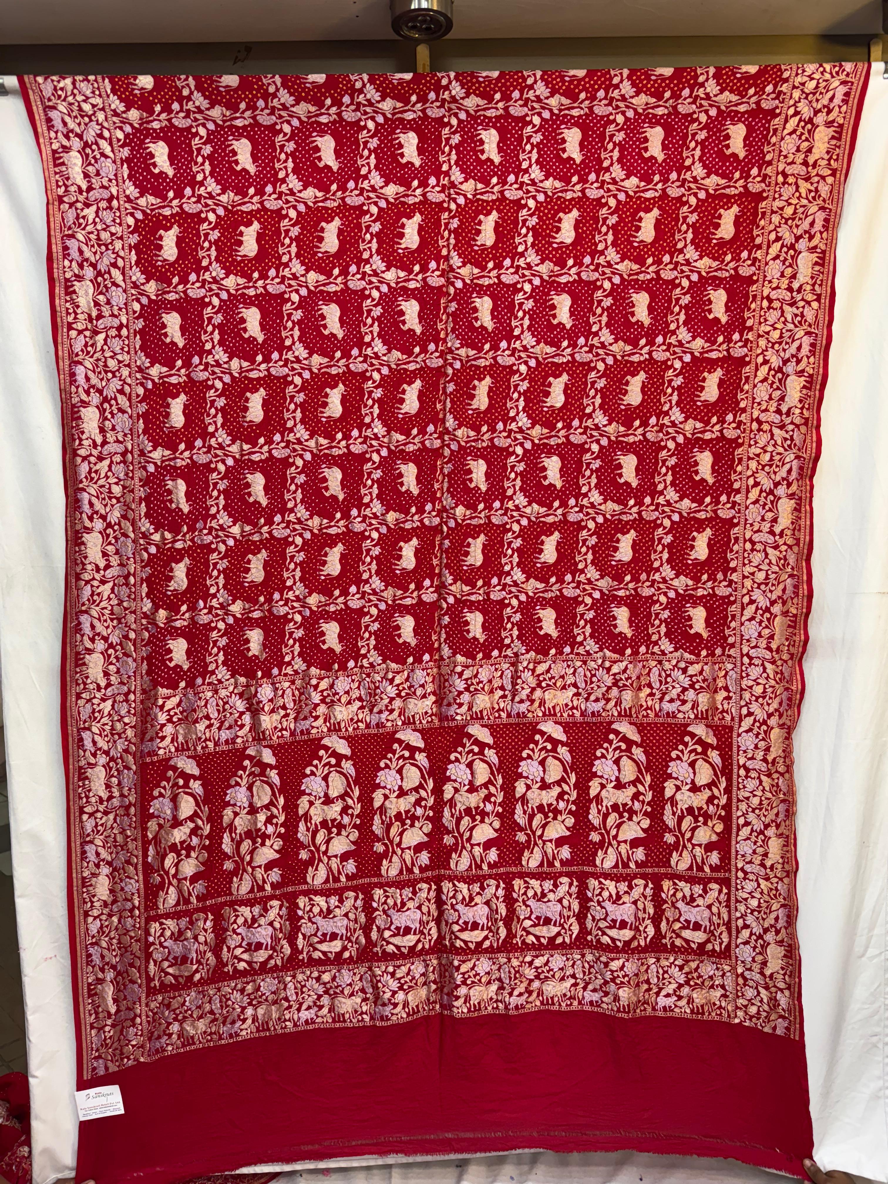 Experience the richness of tradition with the All Over Red BGSA_9034 Banarasi Georgette Saree. Crafted from luxurious Banarasi Georgette, this saree combines the lightweight grace of georgette with the intricate beauty of Banarasi weaving, making it a timeless piece for every saree lover.