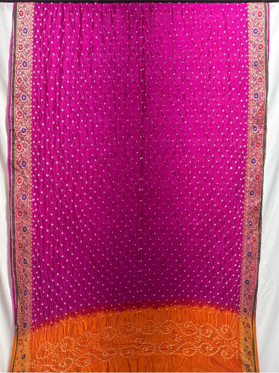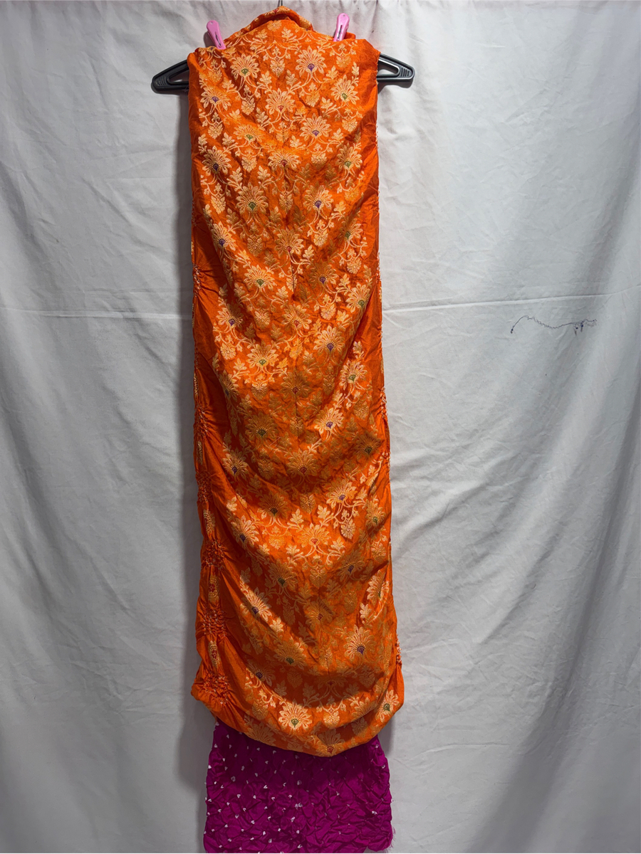 - Color & Work: Orang & Rani pink Calour design embellished with Hand Made Bandhani, highlighting artisanal craftsmanship.