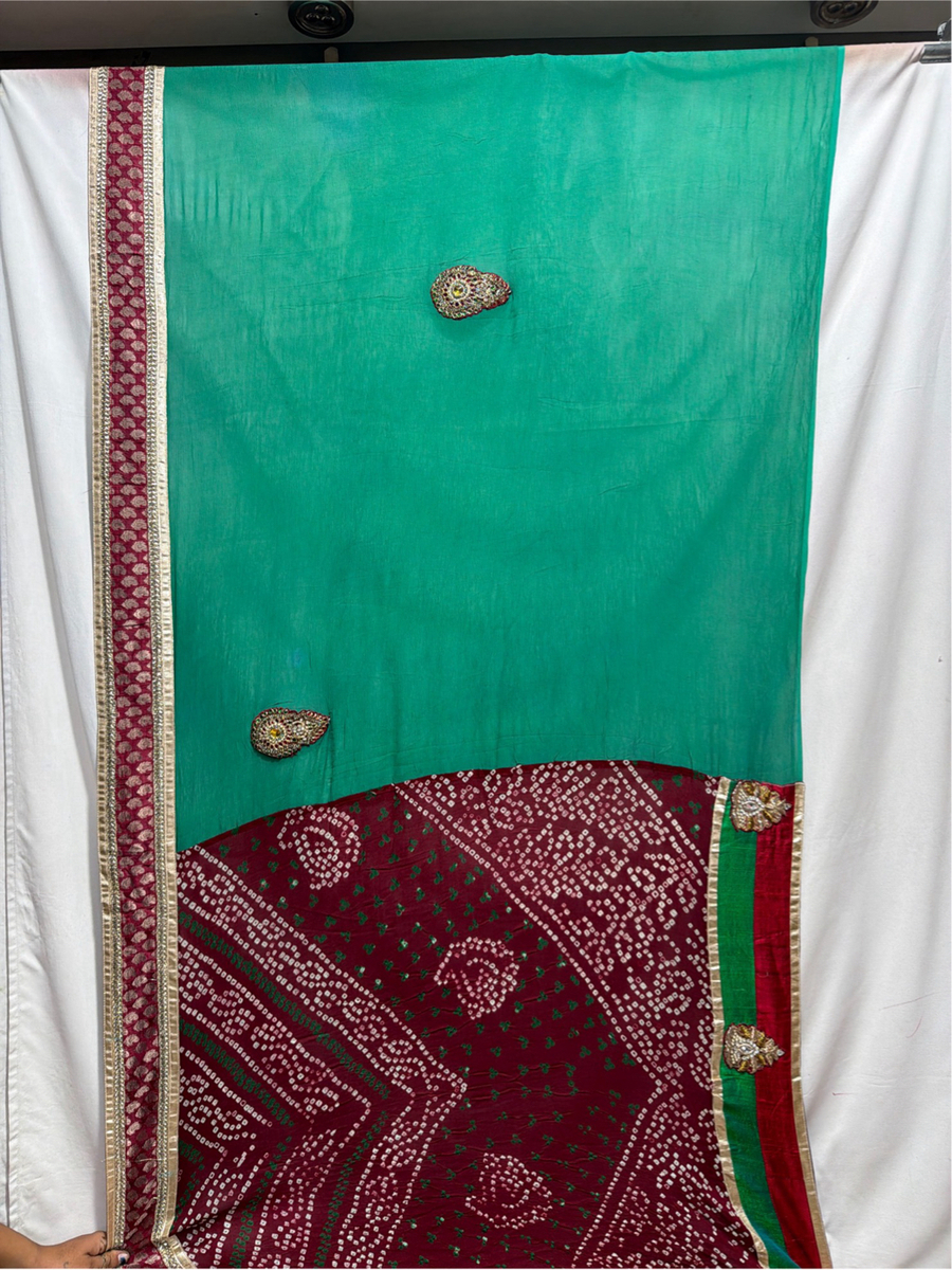 - Handcrafted by skilled artisans in India, combining Banarasi weaving traditions with Bandhani craftwork.
