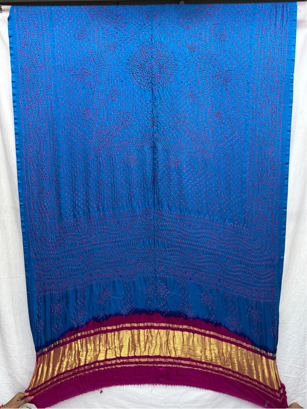 - Design: Sky Blue & Rani tone enhanced by Hand Made Bandhani.