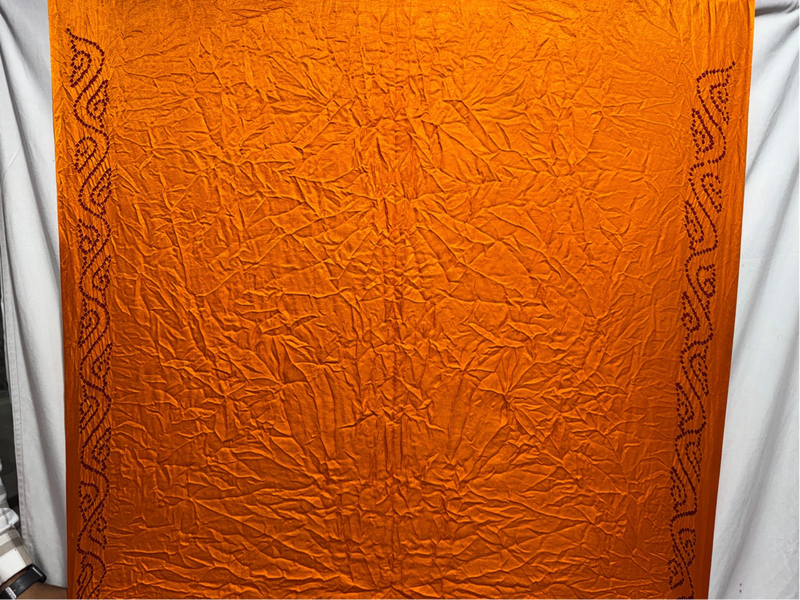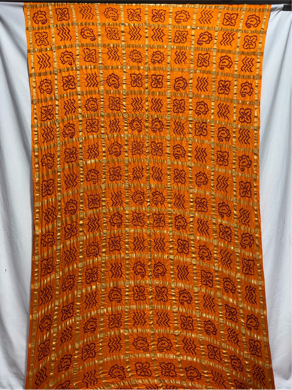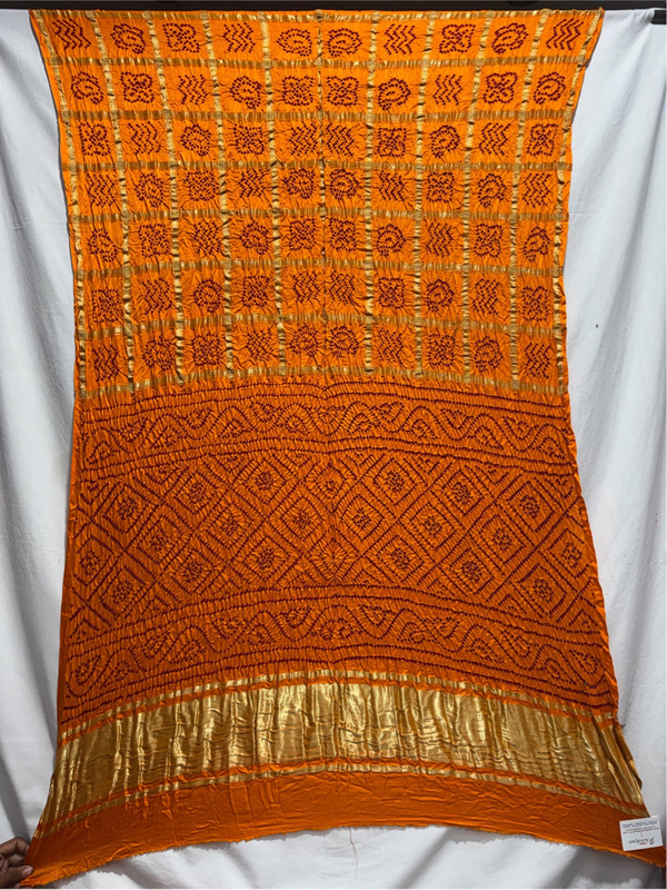 - Color Story: Striking All Over Golden complemented with Hand Made Bandhani Gharchola.
