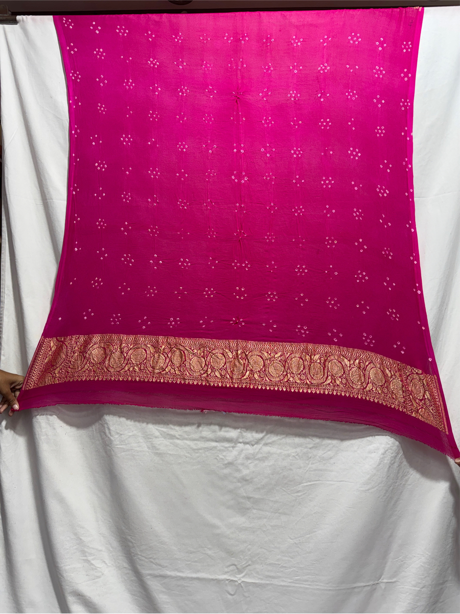 - Material: Made from premium Banarasi Georgette fabric with traditional Bandhani work, offering elegance, comfort, and durability.