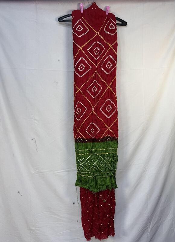 - Design: Red & Mehndi — Hand Made Bandhani motifs across the body.