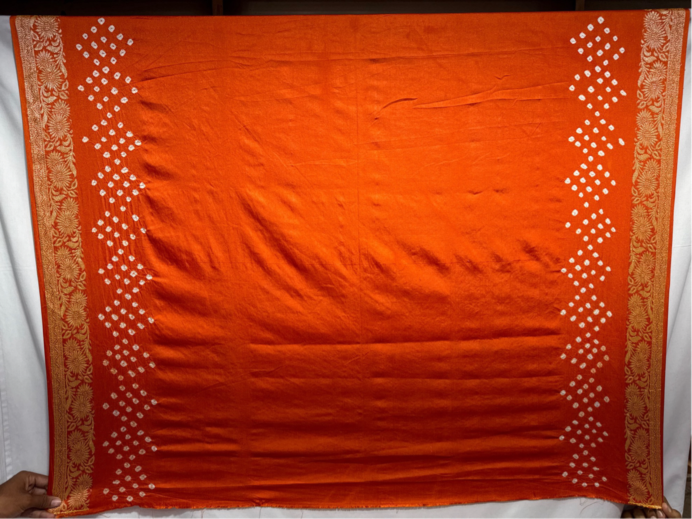 - Design & Shade: All Over Orange base enhanced with Hand Made Bandhani, a true example of cultural craftsmanship.