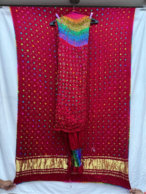 • Color & Work: Multy With Red design embellished with Hand Made Bandhani, highlighting artisanal craftsmanship.