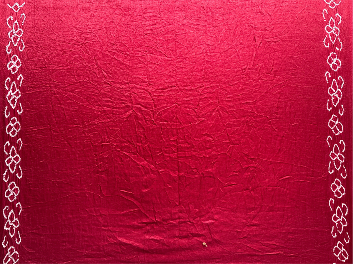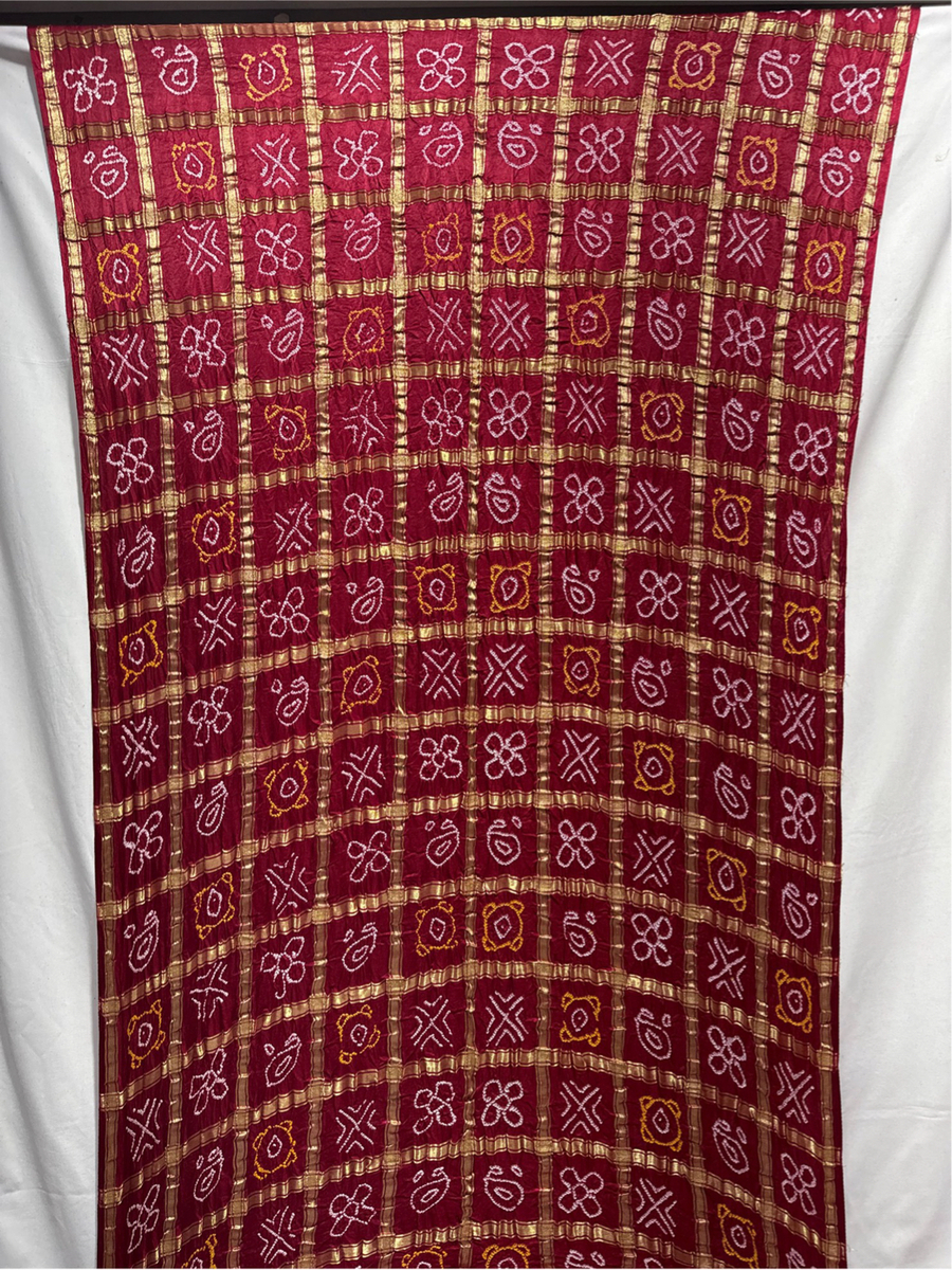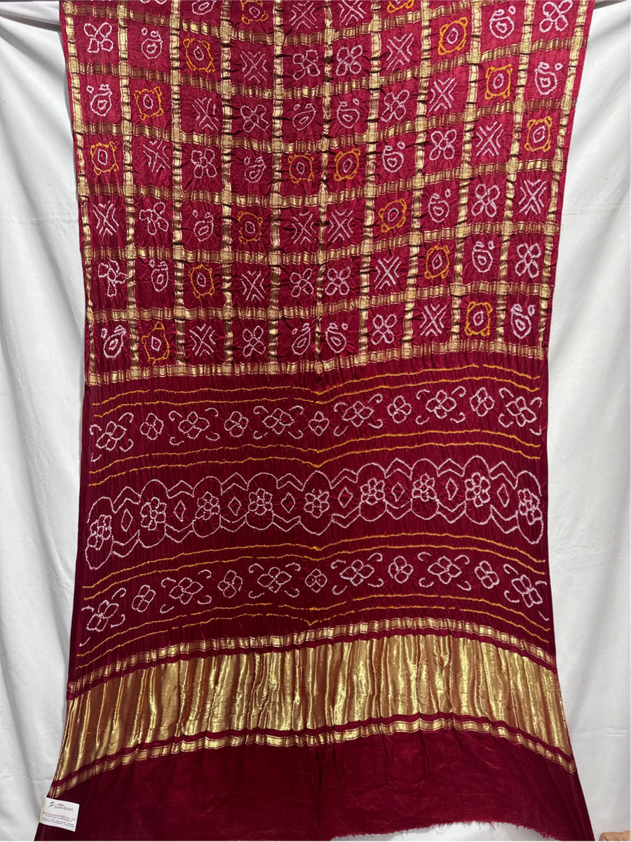 - Color Story: Striking All Over Maroon complemented with Hand Made Bandhani Gharchola.
