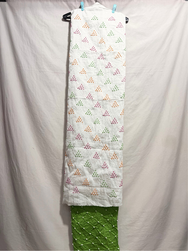Kala Sanskruti White Parrot Green Multi Color Heavy Cotton Satin Bandhani Dress 2.5 M (Each Piece) Elegant Traditional Wear Dress Material for Women