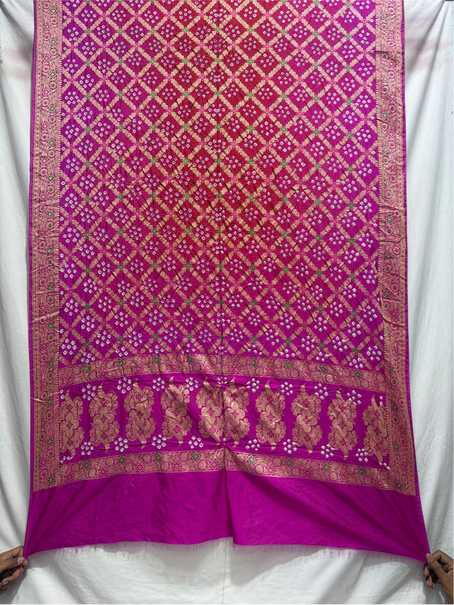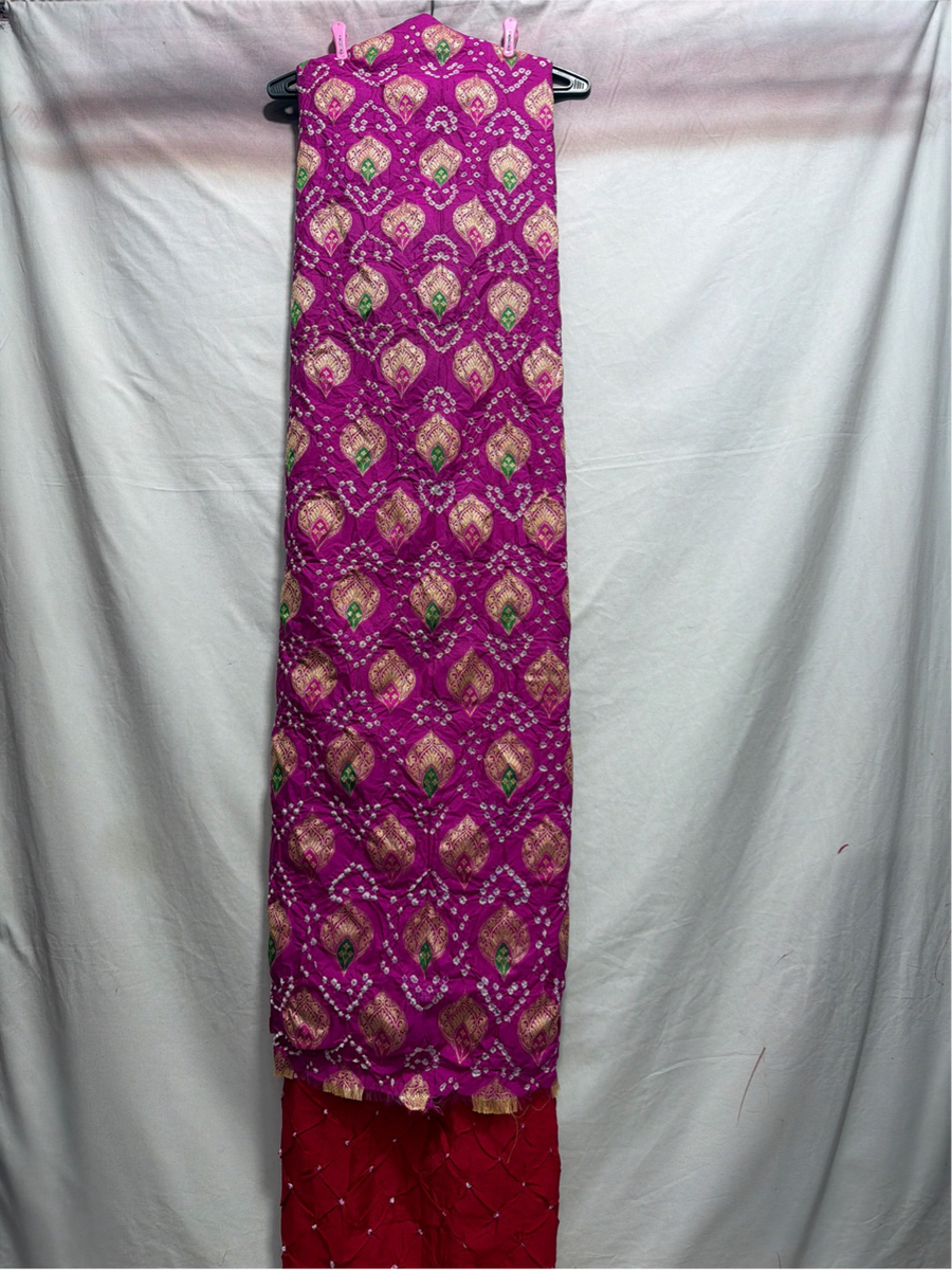 - Color & Work: Rani & Pink design embellished with Hand Made Bandhani, highlighting artisanal craftsmanship.