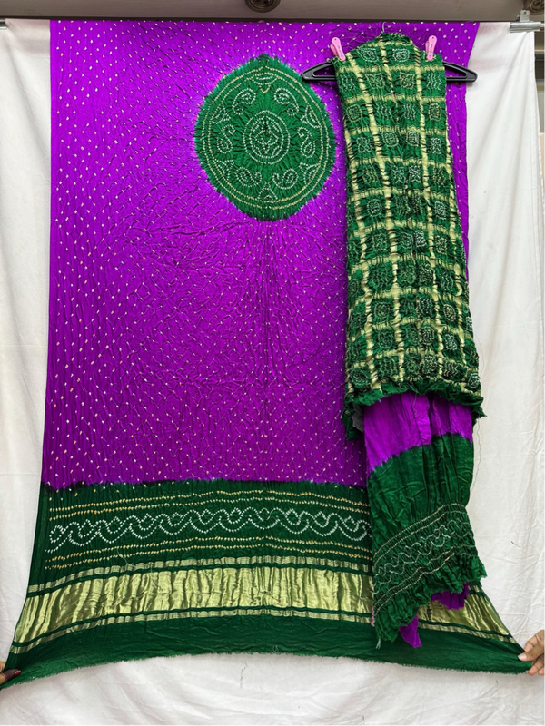- Color & Work: Green & Purple design embellished with Hand Made Bandhani, highlighting artisanal craftsmanship.