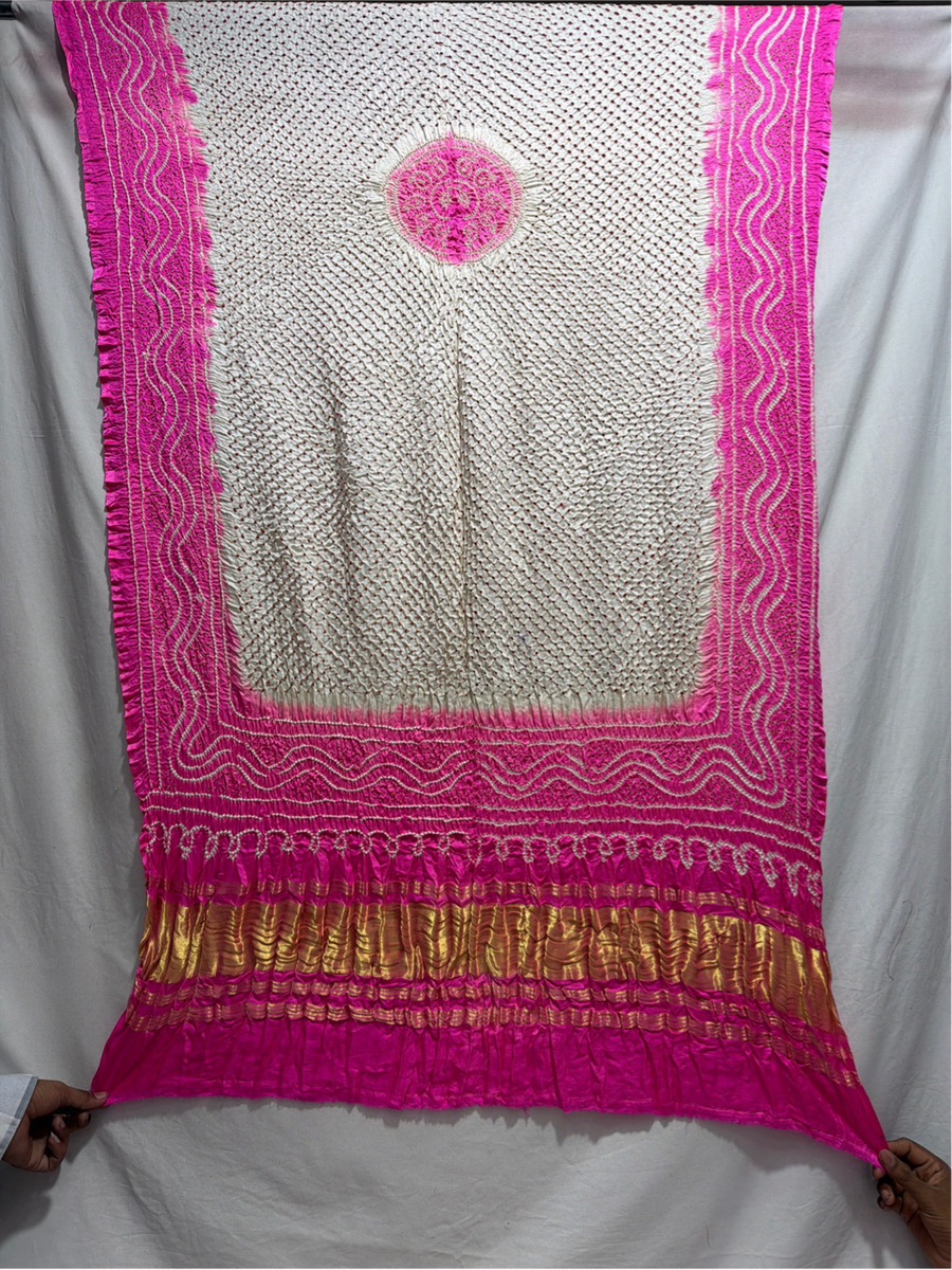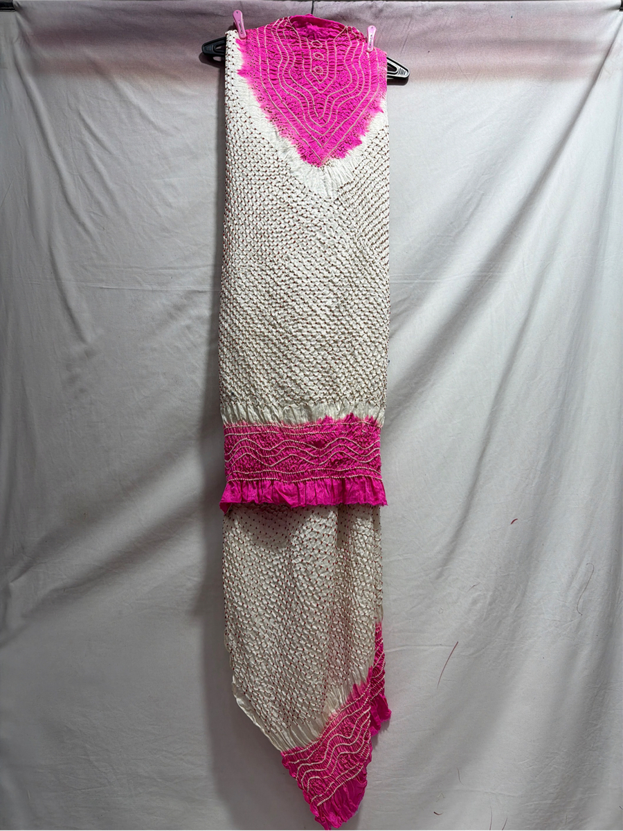 Kala Sanskruti White & Pink Color Gaji Silk Bandhani Dress 2.5 M Each Piece Elegant Traditional Wear Gaji Silk Dress for Women