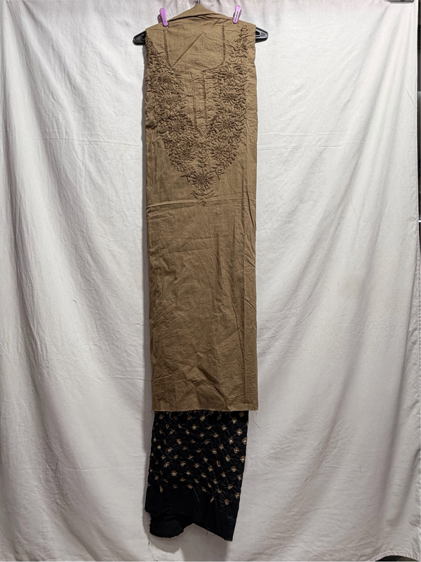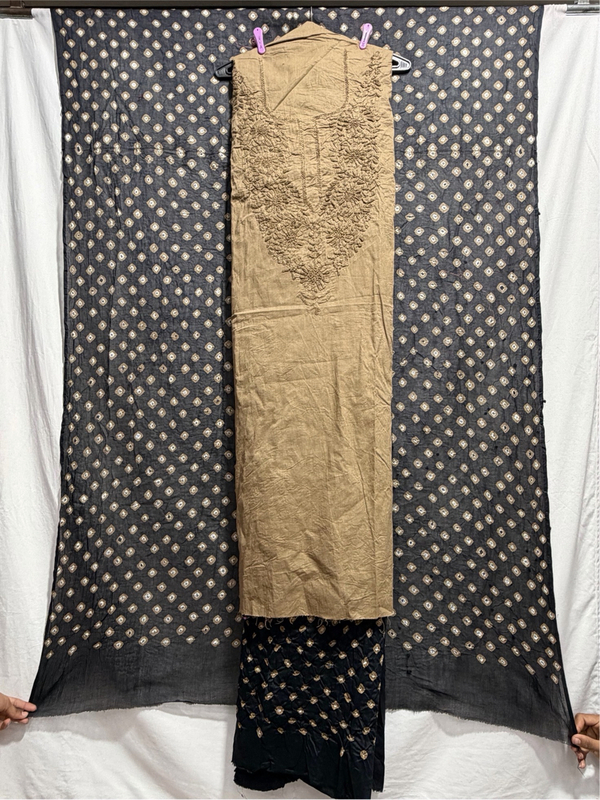 Kala Sanskruti Dark Chiku & Black Color Heavy Cotton Satin Bandhani Dress 2.5 M (Each Piece) Elegant Traditional Wear Dress Material for Women