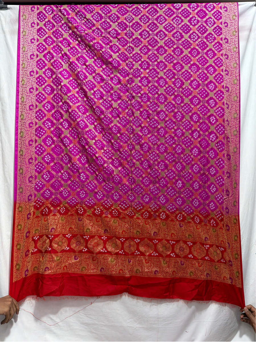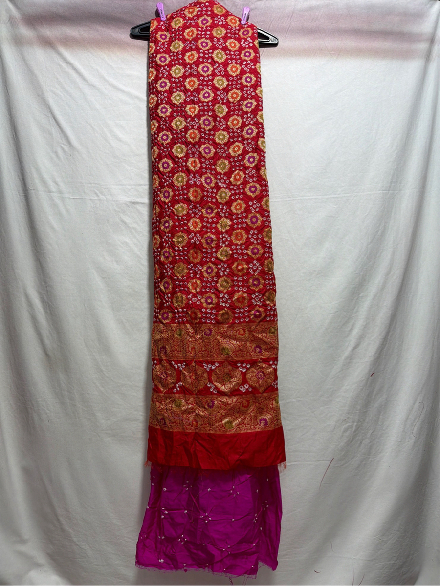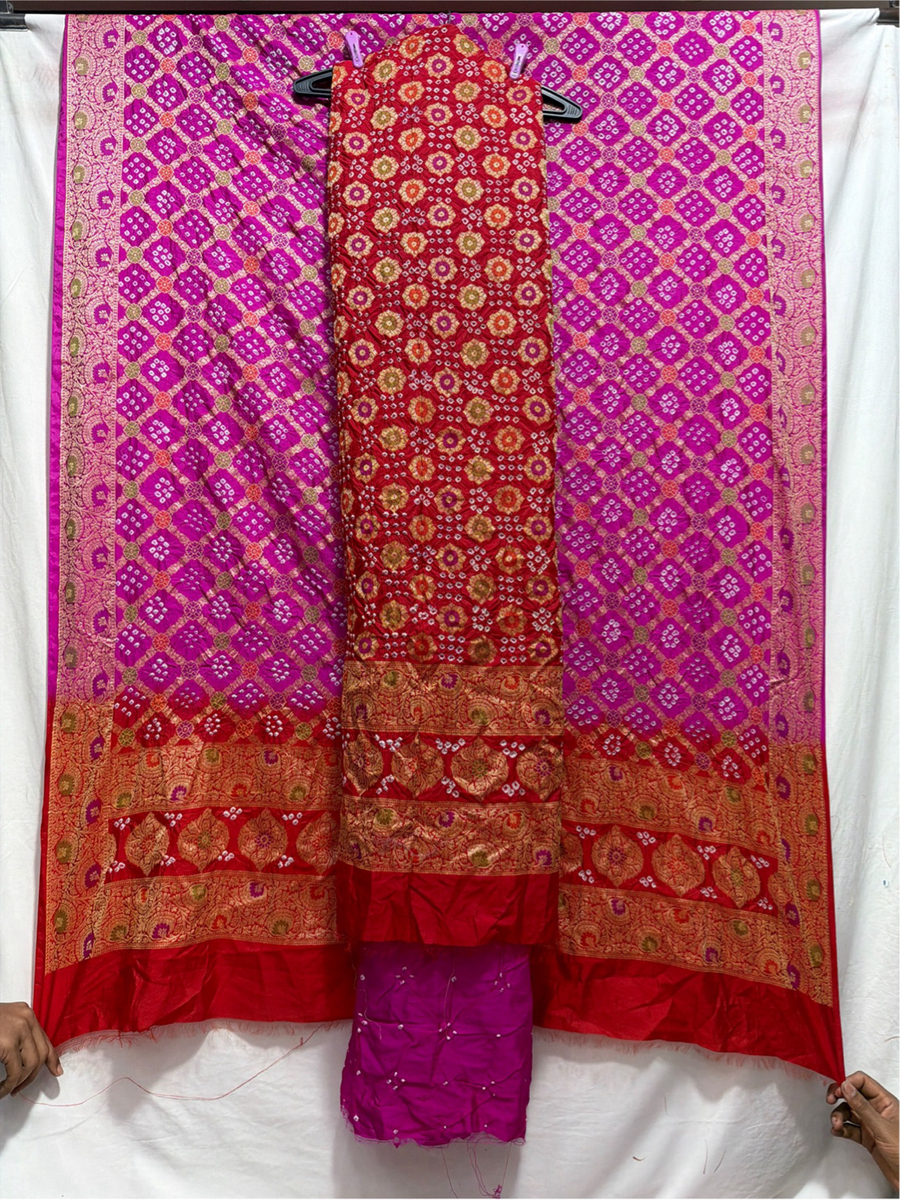 • Color & Work: Red & Pink design embellished with Hand Made Bandhani, highlighting artisanal craftsmanship.