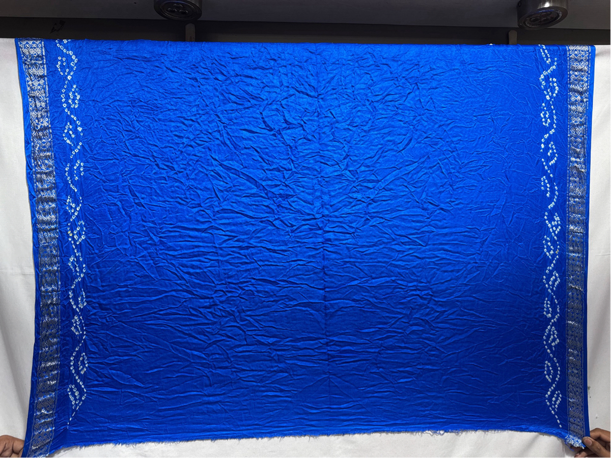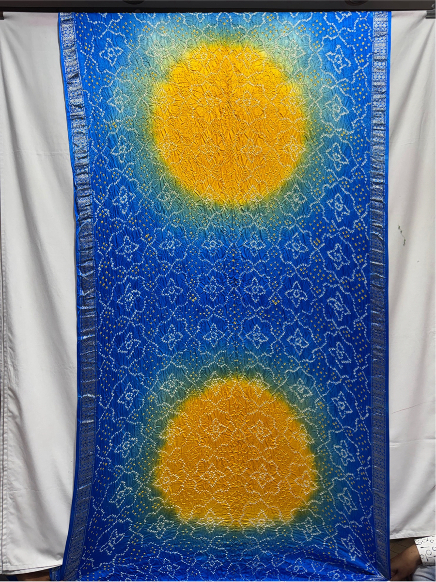 - Color & Work: A Sky Blue & Golden saree adorned with intricate Hand Made Bandhani, designed to make it stand out on festive and wedding occasions.