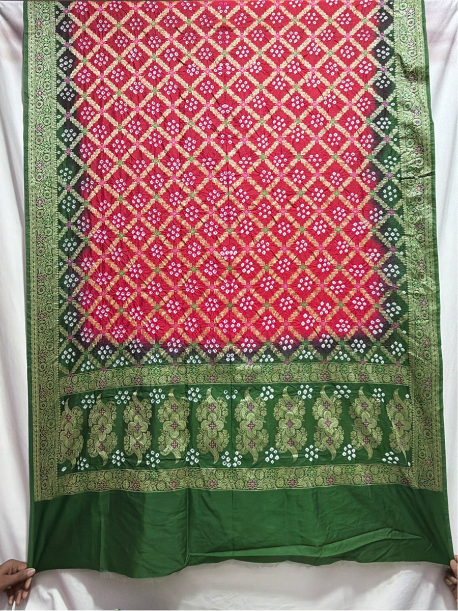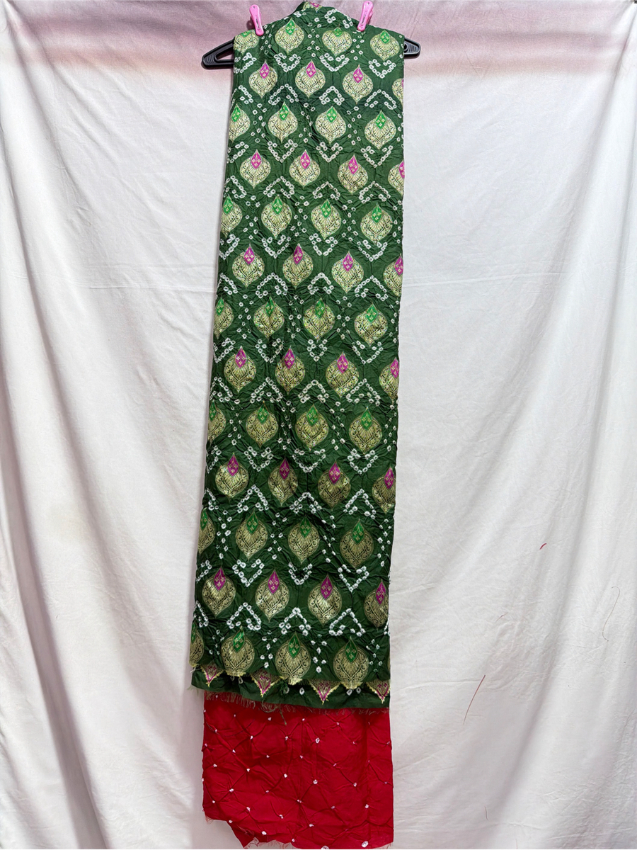 - Color & Work: Green & Red design embellished with Hand Made Bandhani, highlighting artisanal craftsmanship.