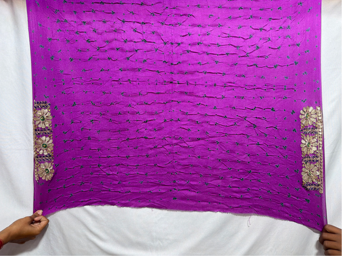 - Intricate Bandhani handwork across the saree, adding depth and cultural charm.