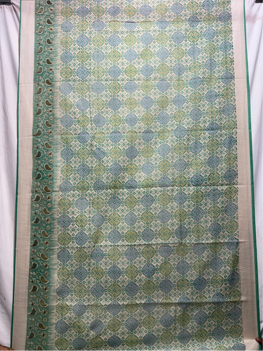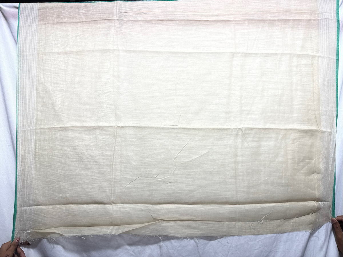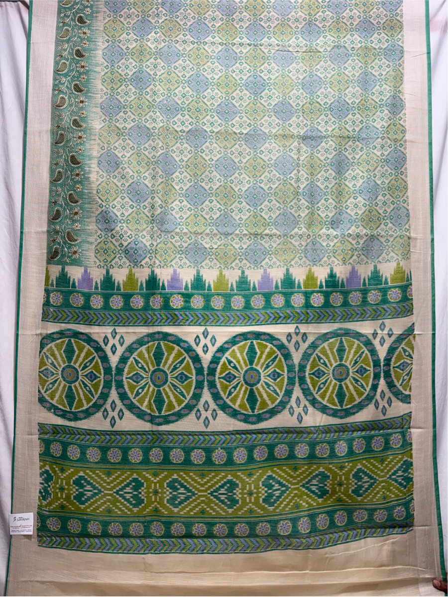 • Color & Work: Cream & Rama Green design embellished with Hand Made Bandhani, highlighting artisanal craftsmanship.