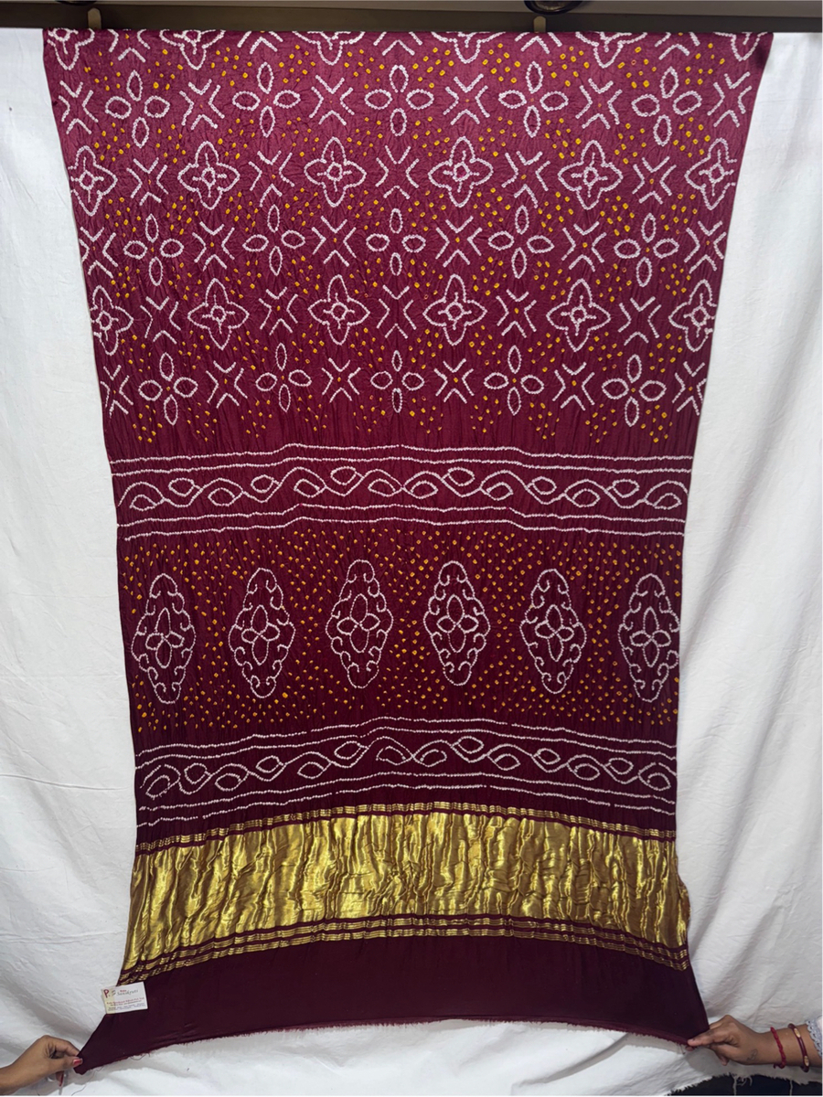 - Color & Work: A all over bargandi saree adorned with intricate Hand Made Bandhani, designed to make it stand out on festive and wedding occasions.