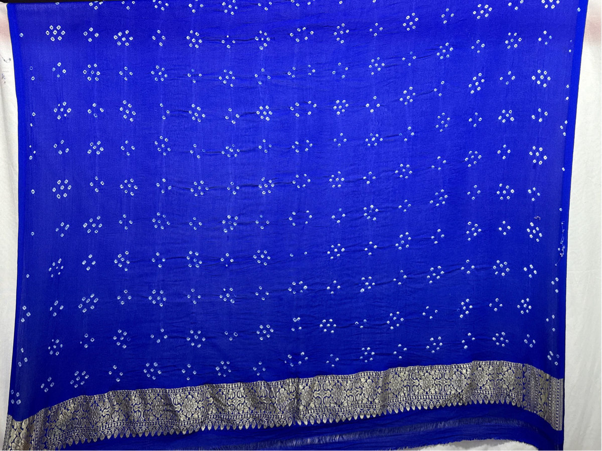 - Color & Work: A graceful All Over Blue saree with delicate Bandhani patterns, reflecting timeless artistry and vibrant charm.