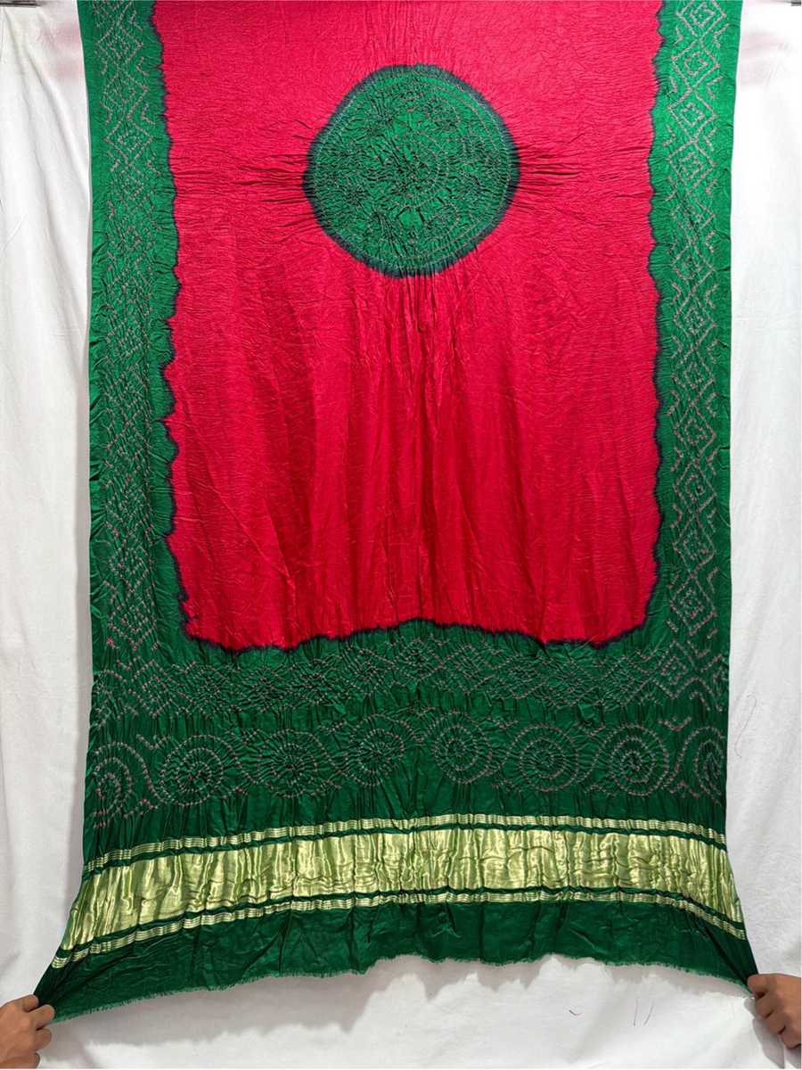 Kala Sanskruti Green & Red Color Gaji Silk Bandhani Dress 2.5 M Each Piece Elegant Traditional Wear Gaji Silk Dress for Women