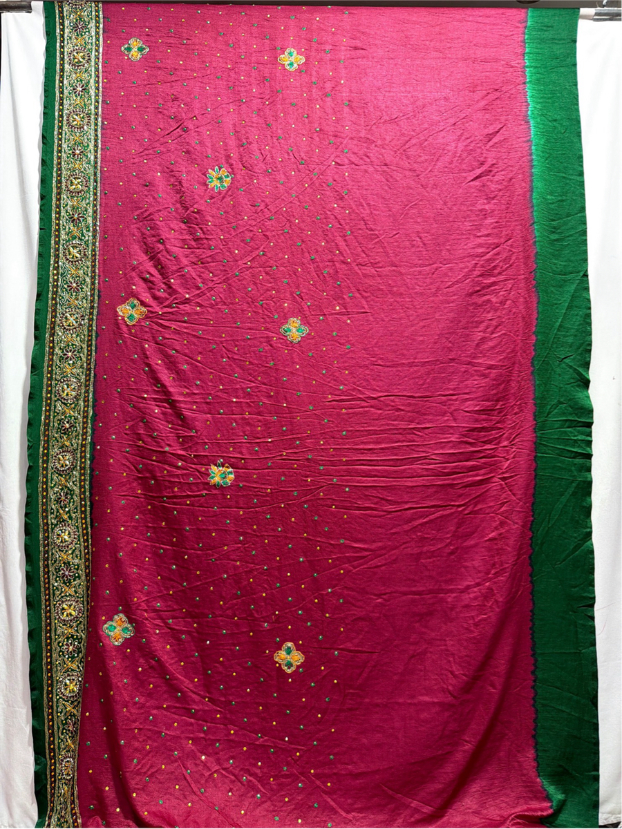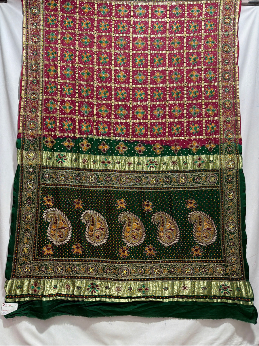 Kala Sanskruti Maroon & Green Color Semi Gaji Bandhani Saree With Hand Work 6.5M Elegant Traditional Wear Graceful Handcrafted Artistry For Woman
