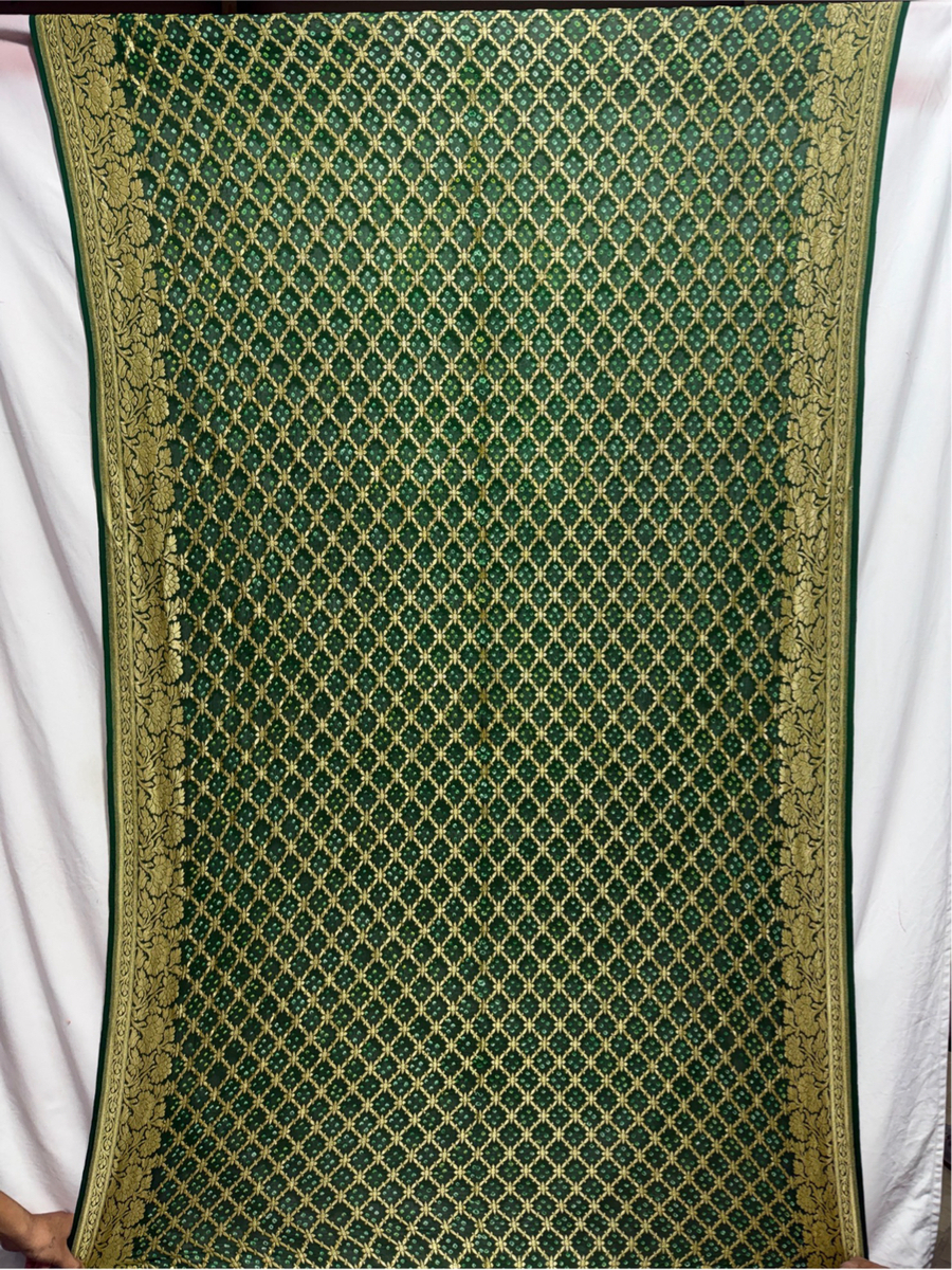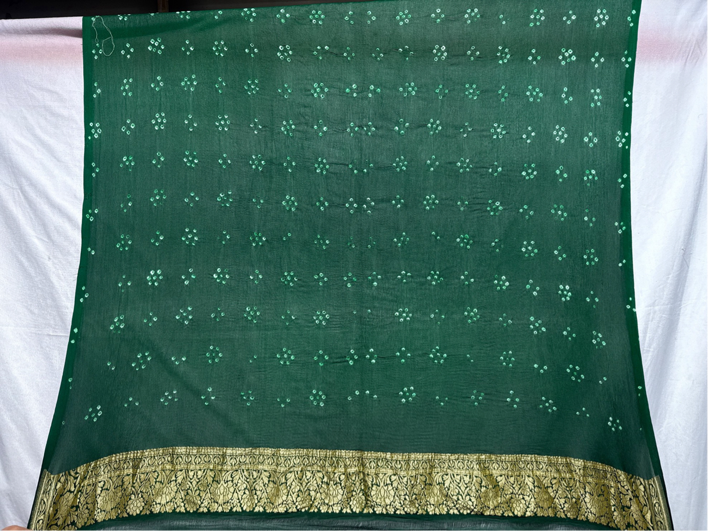 - Color & Work: A graceful All Over Green saree with delicate Bandhani patterns, reflecting timeless artistry and vibrant charm.