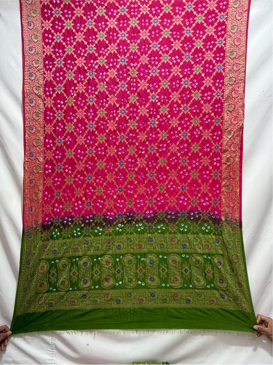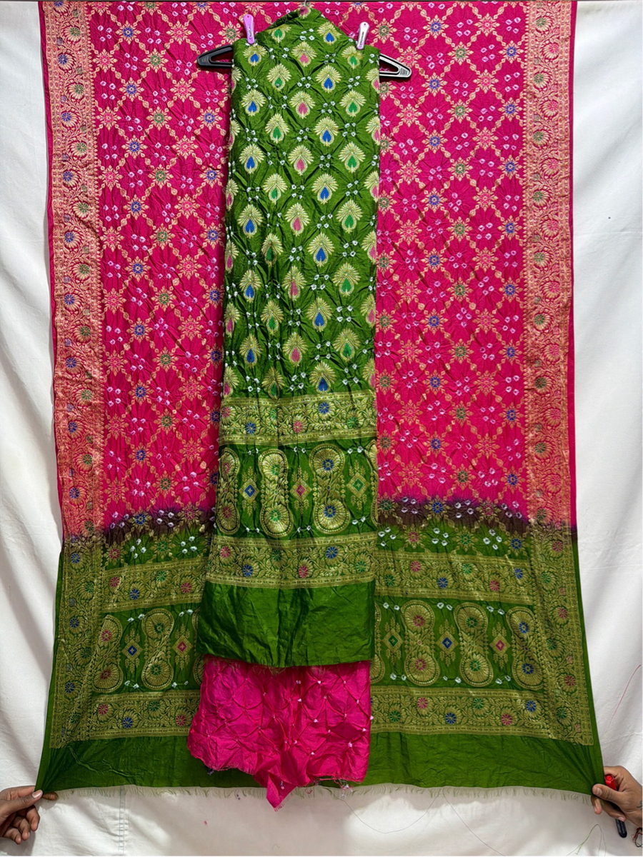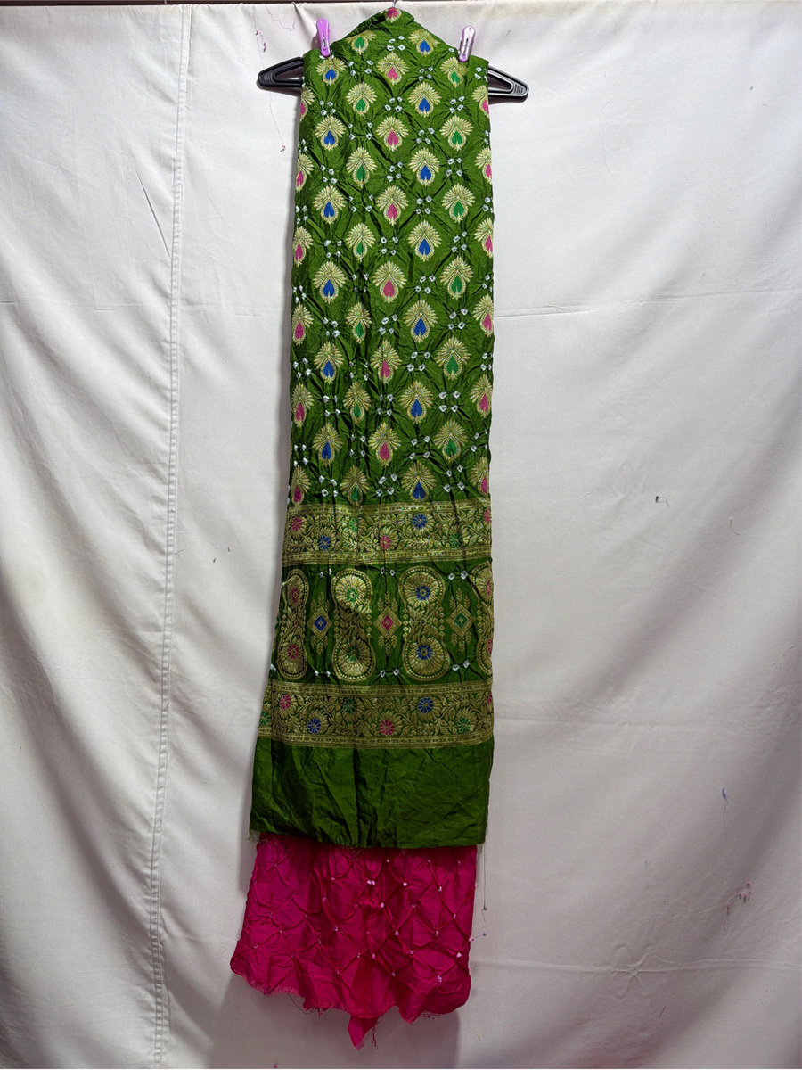 Kala Sanskruti Mehndi & Pink Color Dupion Silk Bandhani Dress 2.5 M (Each Piece) Elegant Traditional Wear Dress for Women