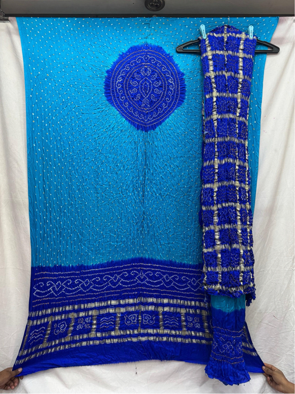 - Color & Work: Blue & Skyblue design embellished with Hand Made Bandhani, highlighting artisanal craftsmanship.