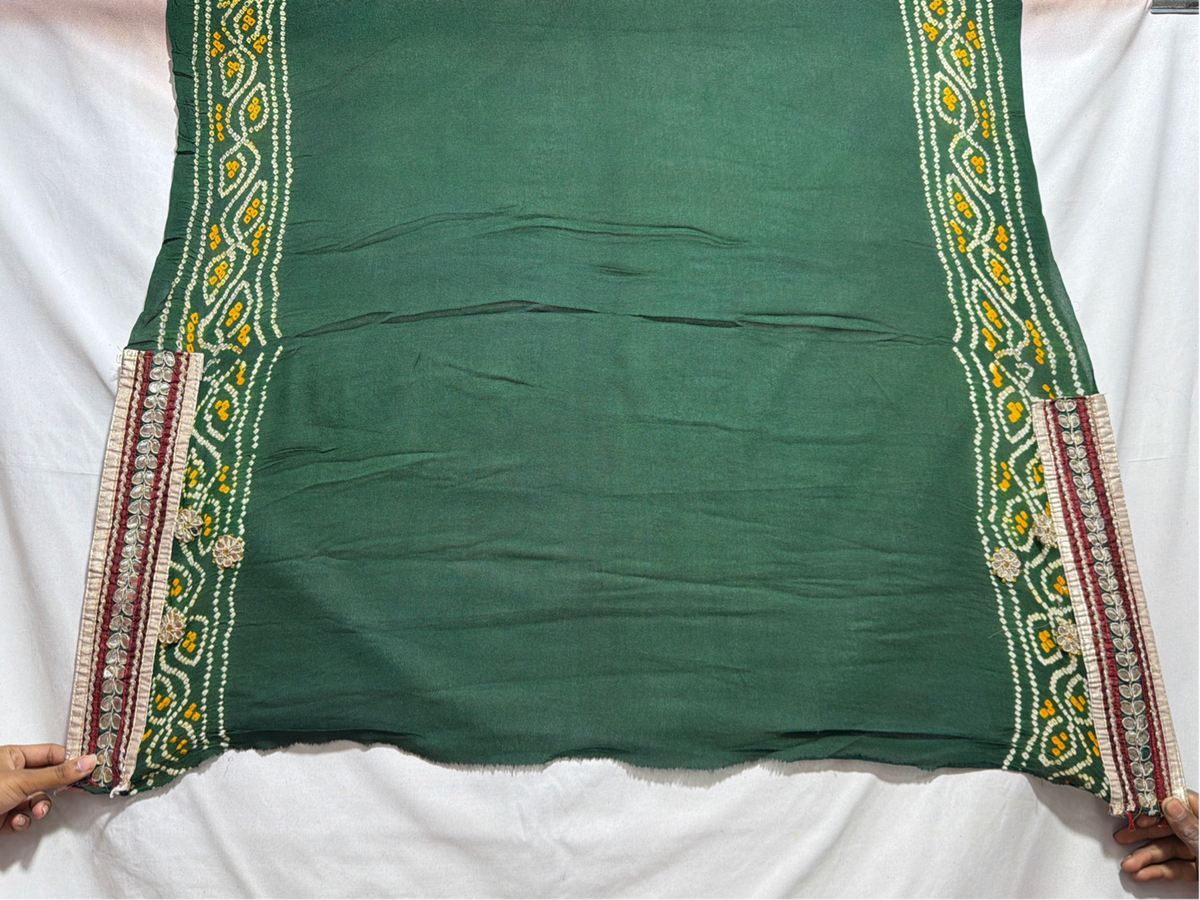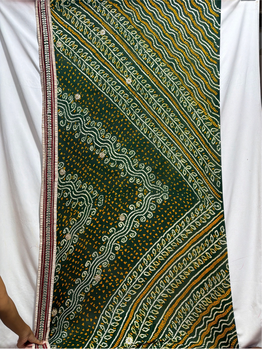 - Color & Work: Designed in an all-over green shade, this saree showcases fine Bandhani handwork that enhances its ethnic elegance.
